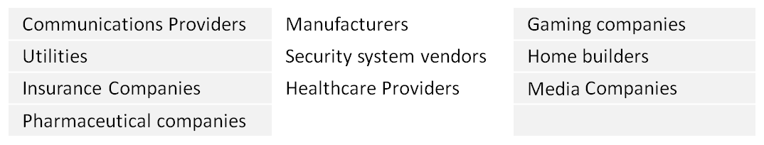 Companies that currently focus in a single-category like energy, entertainment or security can exploit the emerging smart home market to widen their service offering and extend their relationship with customers. The ecosystem model enables both relationship extension and the creation of new revenue streams. As existing revenues come under increasing attack, finding these new sources becomes more critical. Examples of new sources of revenue within the context of the model: gaming companies could add wellness monitoring; communications providers could become primary suppliers of home-security and energy demand management services; Insurance companies could monitor the home and use sensor data to proactively avert damage from a pipe leak. These scenarios enable new or different relationships and revenue streams.