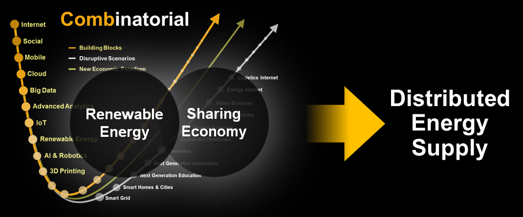 The implications of a sharing economy are not limited to these sectors. In a recent post on Combinations and Disruption, I described the multiplicative effect of combinatorial innovation. The sharing economy is likely to combine with other disruptive scenarios and building blocks to amplify and accelerate the impact of disruption. For example, as the renewable energy footprint expands, energy prosumers could start to share excess electricity with their neighbors through a distributed energy supply. Building on the combinatorial innovation visual above, the renewable energy building block combines with the sharing economy disruptive scenario to create this distributed energy supply. Jeremy Rifkin describes this as an Energy Internet.