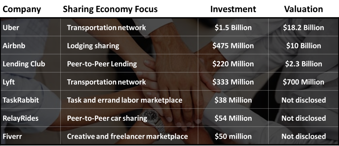 However, the evidence suggests that this train is not slowing. The sharing economy generated $3.5 Billion in 2013, with 17.5 million active American users of sharing economy companies like Uber, Airbnb, and TaskRabbit. Additional evidence shows an accelerating phenomenon with an overall Market Size of $110 billion in 2013, and the leaders in this space are doing very well. Analysts estimate $213 million in Uber revenue last year, and Airbnb now tops the $9.5 billion valuation of the Hyatt Hotels and the $9.3 billion valuation of the Wyndham Hotel Group. Further evidence of traction can be found in an investment community that loves sharing economy companies and their small asset and employee base. A recent piece describes why many are investing in these companies and the visual below shows the magnitude of both investment and valuation.