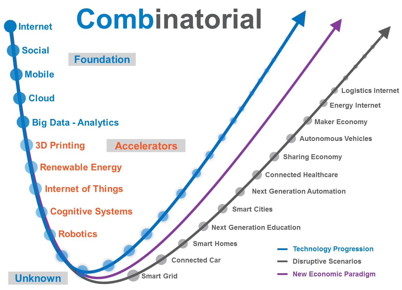The Smart City ecosystem may ultimately be the biggest and most complex ecosystem. As described in previous posts, Combinatorial Innovation accelerates the potential for new disruptive scenarios while enabling their realization. In the Smart City context, disruptive scenarios themselves must come together to enable the Smart city vision, making it an aggressive combination of innovation. The visual below is an expansion of the visual that I’ve used as the anchor for this disruptive scenario series, and describes the combinatorial nature of the smart City: