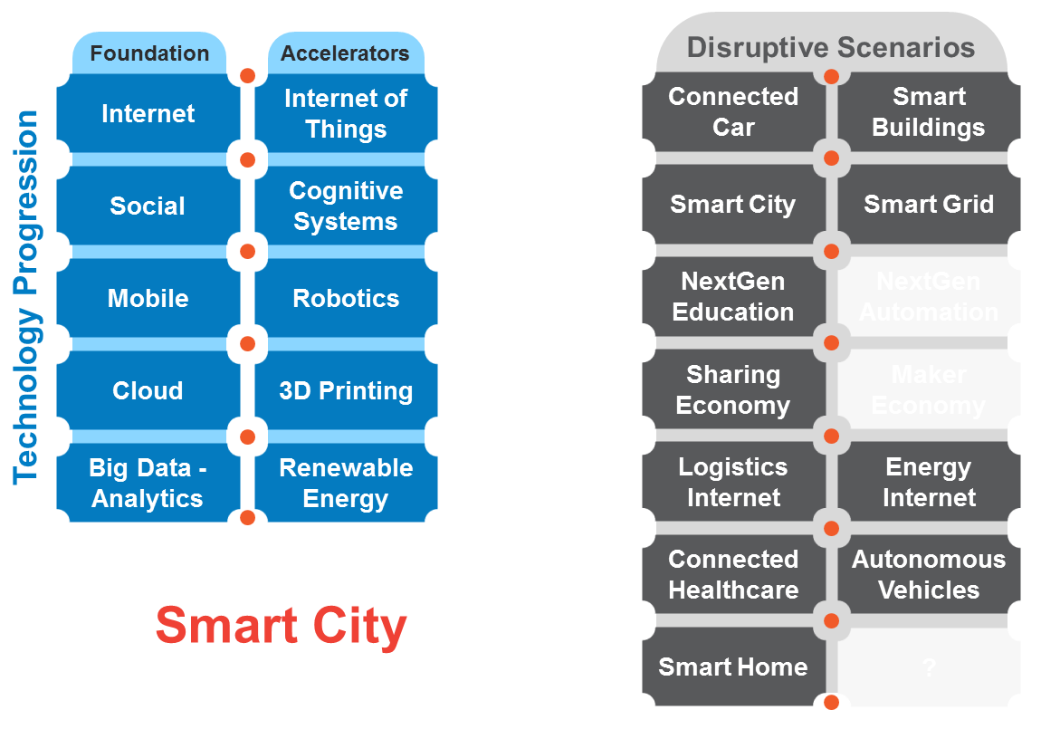 The primary digital forces form the Smart City foundation, which then combine with innovation accelerators like Renewable Energy, Robotics, and others. This technology foundation then combines with the highlighted disruptive scenarios to deliver against the smart city vision. Each of these disruptive scenarios brings a complicated ecosystem of its own, and when combined, forms a mega-ecosystem that amplifies the complexity. Consider the possible combinations of public and private sector stakeholders that have to come together to realize the ultimate vision: participants in complementary ecosystems, communication vendors, energy suppliers, building companies, health providers, education bodies, city planners and developers, system integrators, software vendors, the automotive industry, facility control providers, and technology providers for mobile technology, cloud computing, networking, Machine-to-Machine (M2M), Radio-Frequency Identification (RFID), and more.