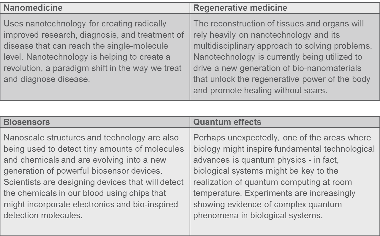 The author for this topic is Sonia Contera, co-director of the Oxford Martin Program on Nanotechnology. The author describes how new powerful techniques enable visualization and manipulation of nanomaterials, and her belief that these scientific advances will lead to applications that have the potential to transform manufacturing, energy production, access to clean water, pollution reduction and prevention, and more functional materials that are stronger, lighter, and cheaper. Two of the areas where she believes nanotechnology will make a substantial and more fundamental scientific and industrial impact are biology and medicine.