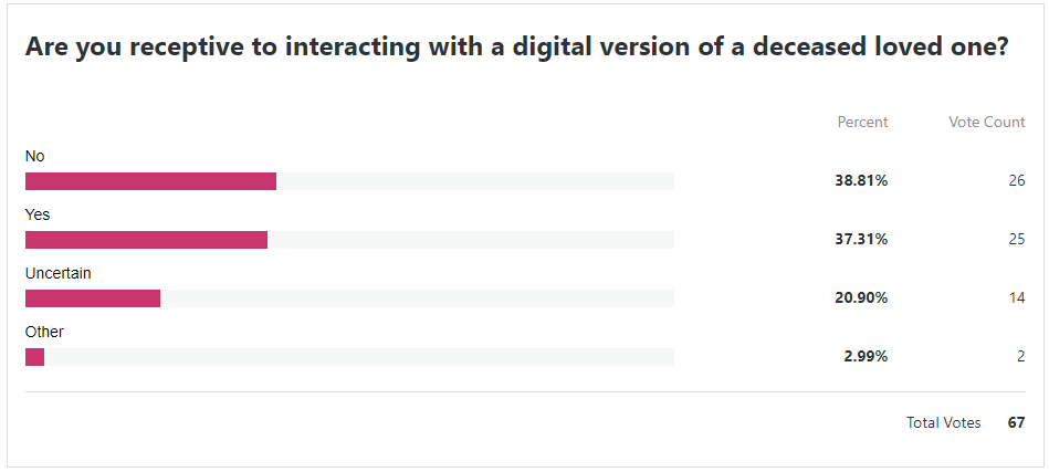 This is not the first example of innovation attempting to address grief, mental health, loneliness and isolation. I previously provided an example of virtually reconnecting with a lost loved one. I asked the obvious question in the post on lost loved ones (please take the poll below): would you leverage these innovations to address mental health challenges? The response I received is reflected in the visual. As the number of innovation-enabled scenarios multiply, the fascination versus fear discussions will intensify. A quote attributed to our ghost Jessica Pereira speaks to why these scenarios will multiply – but in a different context: