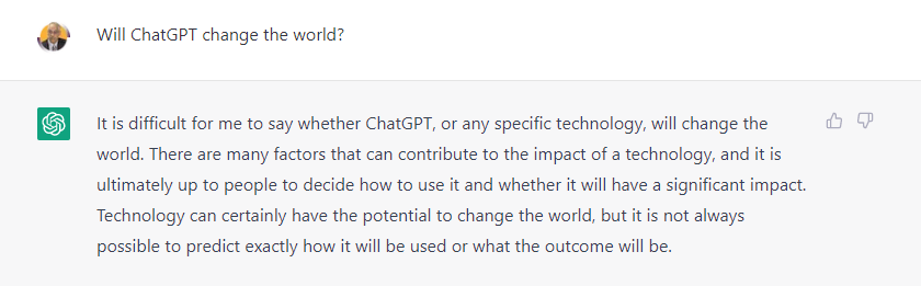 It is unlikely that ChatGPT, as a single technology, will change the world on its own. However, it is possible that the technology behind ChatGPT, which is a large language model trained by OpenAI, could be applied in ways that could have a significant impact on society. For example, large language models like ChatGPT have the ability to generate human-like text, which could potentially be used in applications like automated customer service or language translation. However, it’s also important to note that the development and use of any technology, including ChatGPT, should be carefully considered and evaluated in order to ensure that it is used ethically and responsibly.