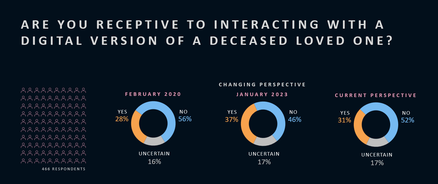Now, three years later, we have a virtual human service called Rememory that is based on AI technology. The service recreates late family members by mimicking their every aspect, from their physique to their voice. We also have another service called HereAfter that preserves memories with an app. The App interviews you about your life, then lets loved ones hear meaningful stories by chatting with the virtual you. Add to this list Mind Bank AI, which covers two specific possibility spaces, with a possible third connected to the topic of interacting with lost loved ones: