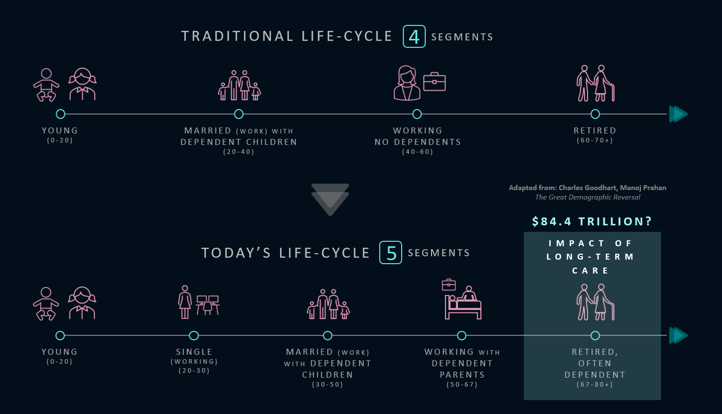 A more recent article paints a very different picture – one that I have focused on in my various presentations. This visual from my presentation depicts a shift in our traditional four segment life-cycle to five segments. This shift has a lot to do with the notion of wealth transfer. Here is a summary of the recent article that explores this in greater detail.