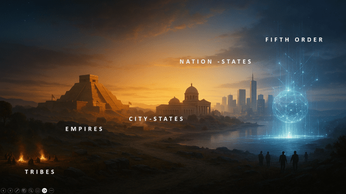 The long arc of governance can be read as a journey of belonging – shared blood, centralized rule, civic participation, national identity, and now digital belonging. The Fifth Order may not be a single model at all, but a distributed architecture: part algorithm, part city, part collective consciousness. It may govern less through territory and more through coordination – the flow of data, values, and shared purpose.