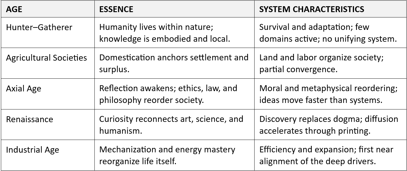 Across the long arc of human history, certain moments stand apart — when the logic of civilization itself is rewritten. Each age captures one of those moments: a step change in how humanity organizes knowledge, power, and meaning. What begins as gradual accumulation eventually crosses a threshold, producing a new pattern of life that feels inevitable only in hindsight. The record of these five ages reveals how convergence has grown stronger with each turn, drawing more domains of life into the process of reordering.