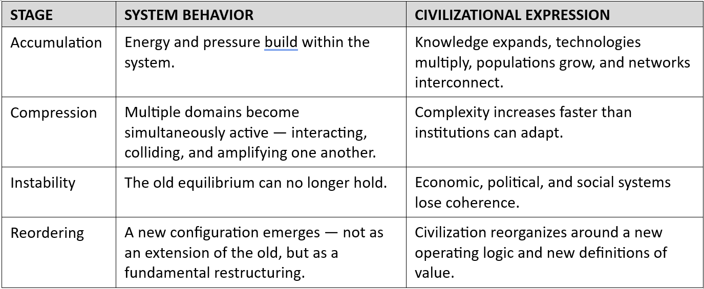 This pattern matters because it helps interpret the moment we are living through now. More importantly, it helps all of us interpret it. We are collectively inside a period where pressures across science, technology, economics, society, geopolitics, the environment, and philosophy are interacting at high speed. The signals look familiar. They resemble late compression and early instability — the same phases that preceded past reorderings. Not everywhere, not uniformly, but across enough domains to matter.