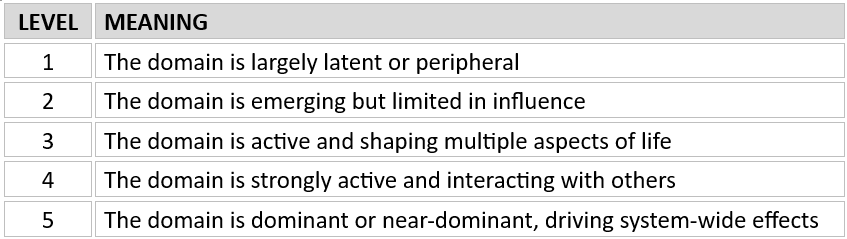 To compare these patterns across ages, we need a consistent activation scale. The scale must be simple enough to use across thousands of years and expressive enough to reflect real differences in how active the domains were. A 1–5 scale serves that purpose. Each level represents a recognizable pattern in the historical record.