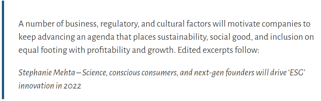 When viewed through a business lens, each bucket drives focus on sustainable development. The big question for the year is: how do you measure it? It’s one thing to say that sustainability, social good, and inclusion are on equal footing with profitability and growth – it’s another to realize it. A recent book via Alec Ross provides some ideas regarding measurement. Measurement aside, there are plenty of signs that focus will be there. In a recent article on ESG, author Stephanie Mehta Fast Company Impact Council provides insight from members of the council.