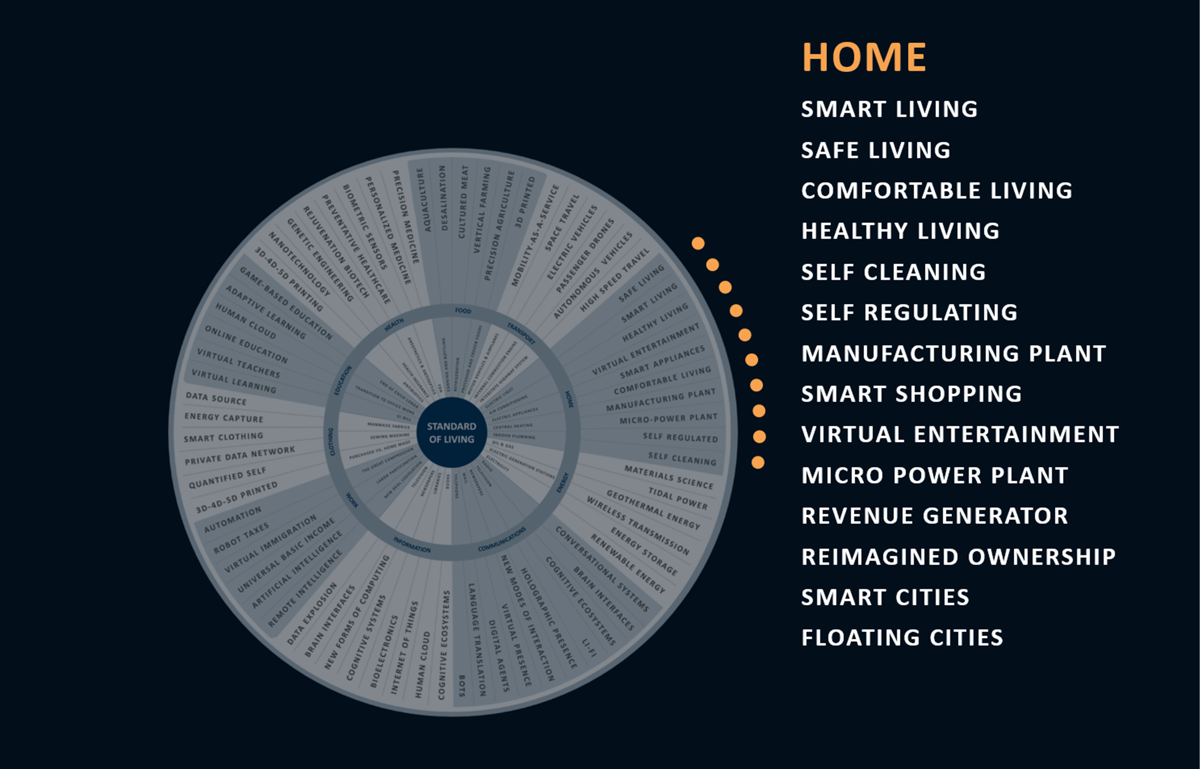 Yogi Berra is credited for once saying that the future ain’t what it used to be. What a perfect way to describe what is coming: a complete change in the way we think about the future. Our journey to the future begins with a look back. A convergence of multiple forces during a special century following the U.S. Civil War established the standard of living in developed economies. Some believe that we will never see a convergence of forces as dramatic and impactful as that which occurred during this period. I pulled this wheel together to capture that convergence across the various areas of our well-being, leveraging the work of economist Robert J. Gordon. I captured his thinking in a recent post titled Revolution and the Innovation Wheel.