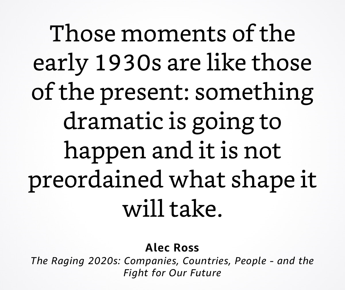Energy transitions throughout history have ushered in times of dramatic change. While energy may be the biggest piece of this emerging story, it is part of a bigger narrative in what increasingly looks like a phase transition. That notion of dramatic change is echoed by several prominent sources. For example, Alec Ross in his recent book The Raging 2020s speaks of a world that resembles the 1930s, a growing sentiment that maps to my research on the period beginning in 1920.